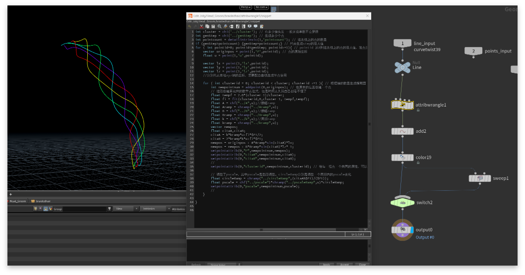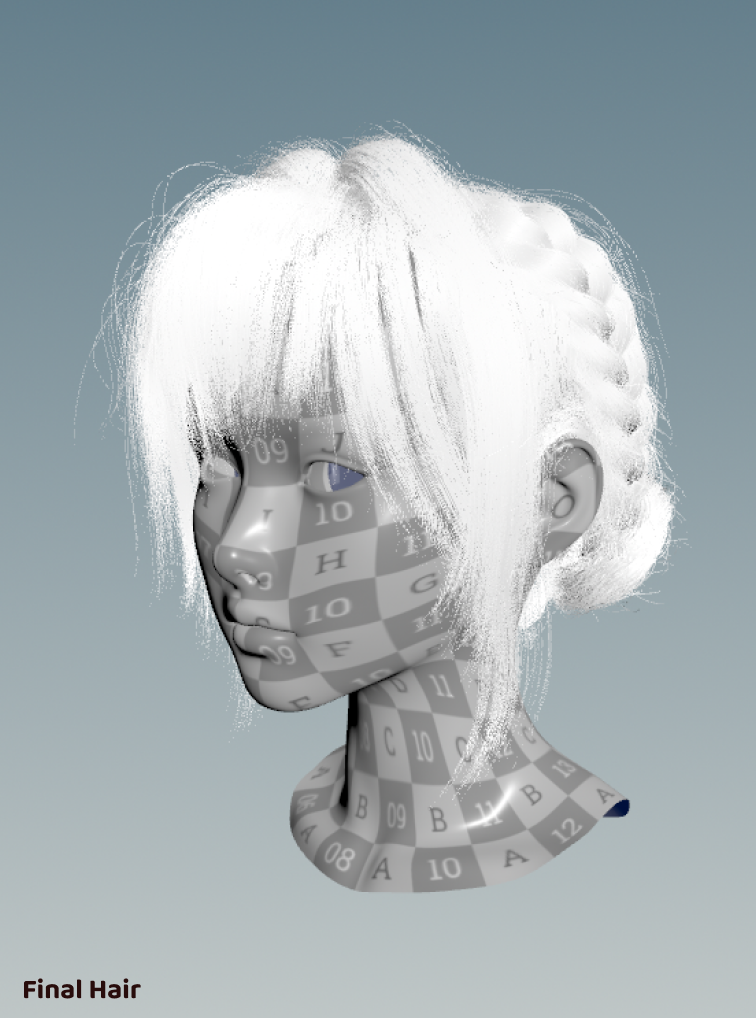 In order to implement Violet’s braided hair, I wrote a node to generate braids programmatically. Although there are tools with similar effects in Maya, Houdini provides lower level deformation tools.